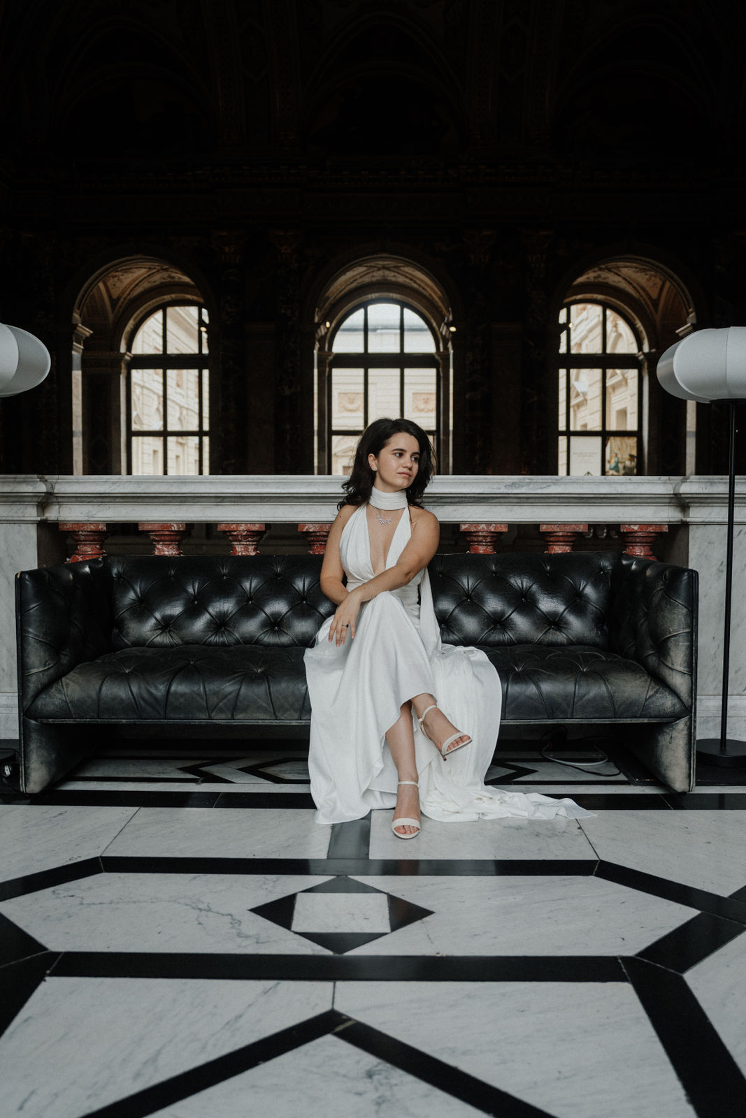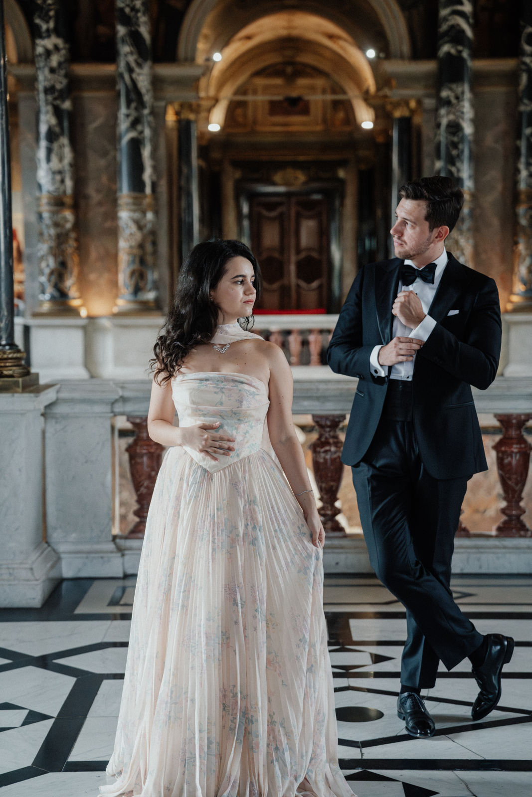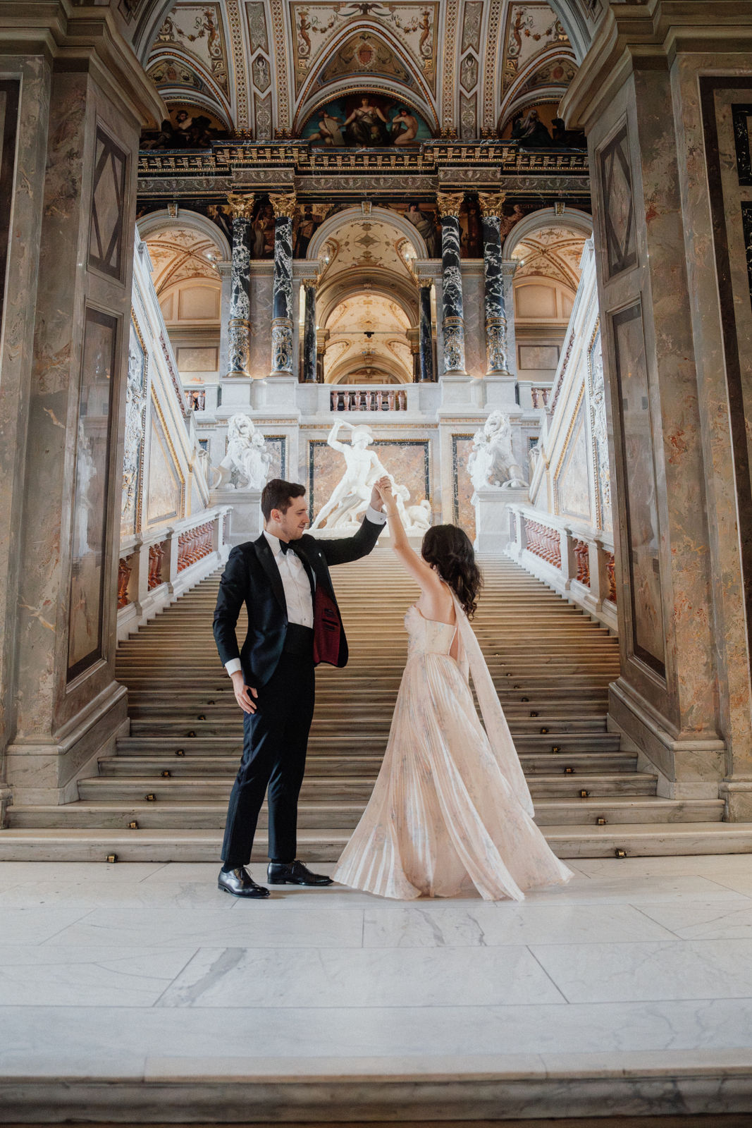 Alexandra und Claudia haben im Kunsthistorischen Museum in Wien eine unvergleichliche Kulisse gefunden, die perfekt ihre zeitlose Eleganz unterstreicht.